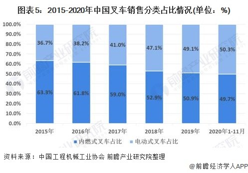 2020年1-11月份的累计销量达到72.56万辆,与2019年同期相比增长30.3%,其中电动式叉车销量占比达到50.3%,比2019年增长1.2个百分点,主要是受环保要求和室内作业环境要求的驱动,电动叉车需求持续增长。