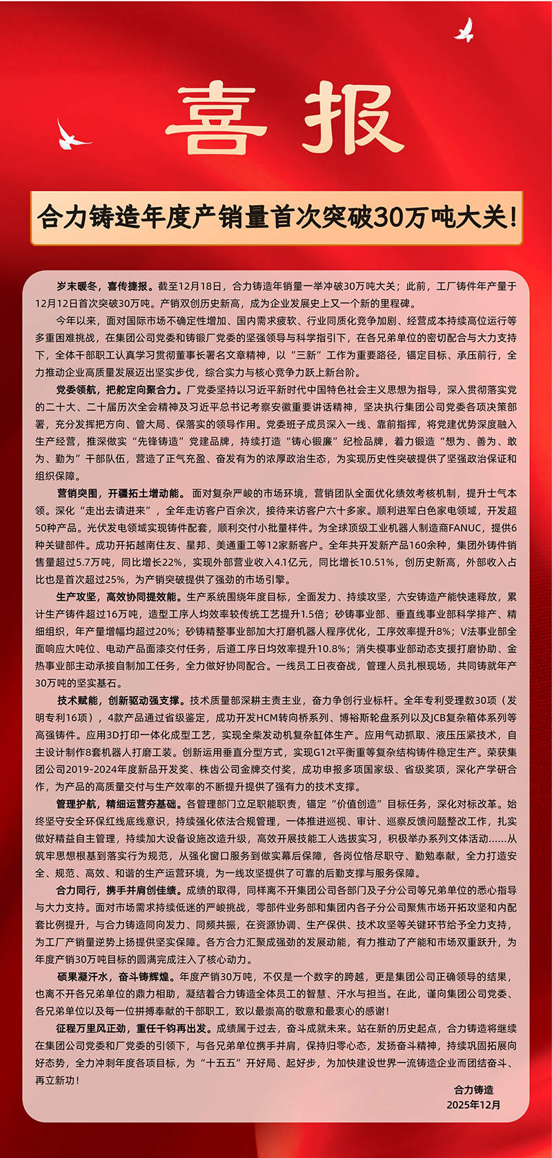 喜报!合力铸造年度产销量首次突破30万吨大关!