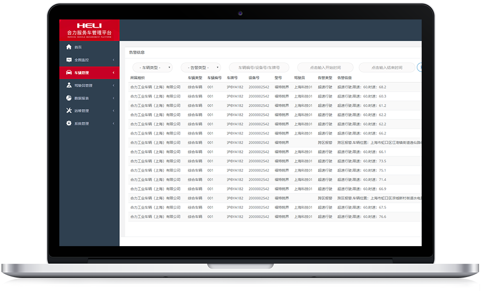 所属组织车辆实时定位跟踪,监控车辆的实时位置信息、车辆开关机状态、车速、定位状态、故障告警等。随时了解车辆的行踪,全面掌握车队的运行状态。
